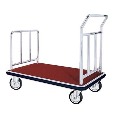 Платформа тележки покрыта ковролином в малым ворсом бордового, синего цветов. Поручни выполнены из зеркальной нержавеющей трубы.