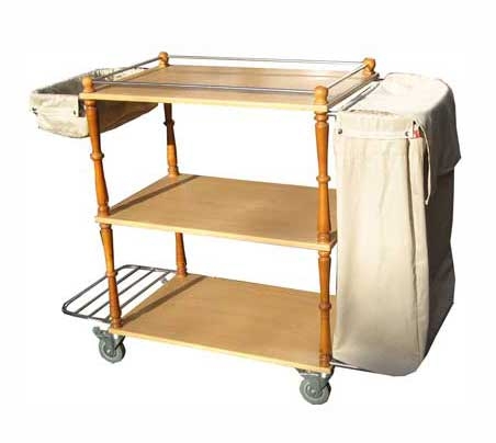 Тележка для горничной с полками из МДФ для развоза чистого белья и резными деревянными ножками стилизованными под старину, полка из нержавейки для ведер, мешок для сбора грязного белья.